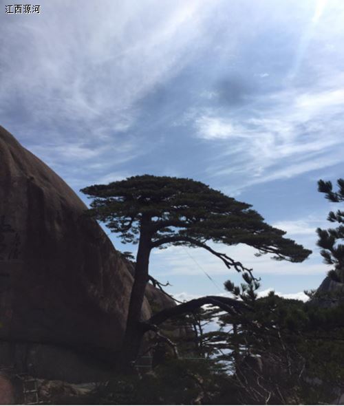 迎客松,此时已经屹立在玉屏峰左侧,恭候多时。虽然早已在各处的屏风与厅堂的背景图上,目睹过她的俊姿芳容,今天有幸近距离的与她亲密接触,不禁为她优美的姿态,遒劲的身枝所倾倒,虽饱经风霜,却仍然郁郁苍苍,生机勃勃,给险峻的玉屏峰添姿增色而折服。那舒展的树枝,象是垂盈的双臂,每天热情亲切的迎接着骆绎不绝的八方贵客,她那“顶风傲雪、坚韧不拔、众木成林、广迎四海”的高贵气质与容度,感染着每一位慕名而来的游客,令人思绪满怀。生活中的我们,不正是缺少迎客松这种接纳他人包容万物的大度,而常使自己因鸡毛蒜皮的小事陷于耿耿于怀之中吗?