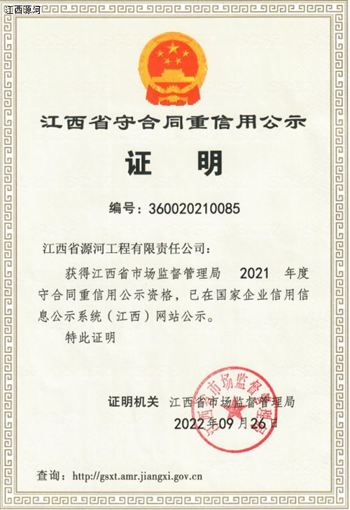 年10月21日,我公司荣获2021年度江西省市场监督局守合同重信用公示单位,并获得公示证书。